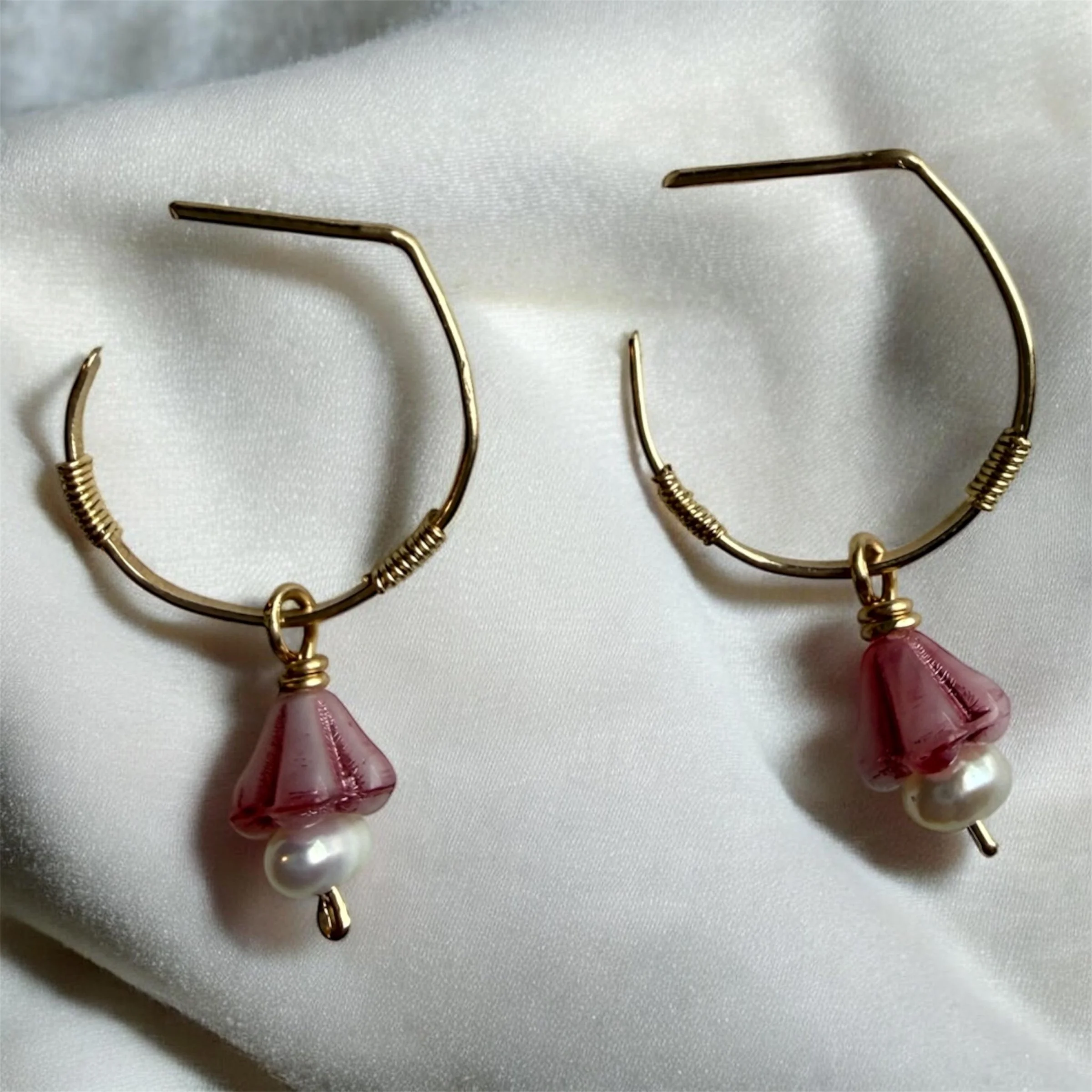 Dangling gracefully from the center of each hoop is a delicate, vintage-inspired Czech glass flower in a soft, dusty rose hue. A shimmering mini freshwater pearl sits at the base of each bloom, adding a classic, lustrous finish that elevates the design from a simple accessory to a wearable piece of art.